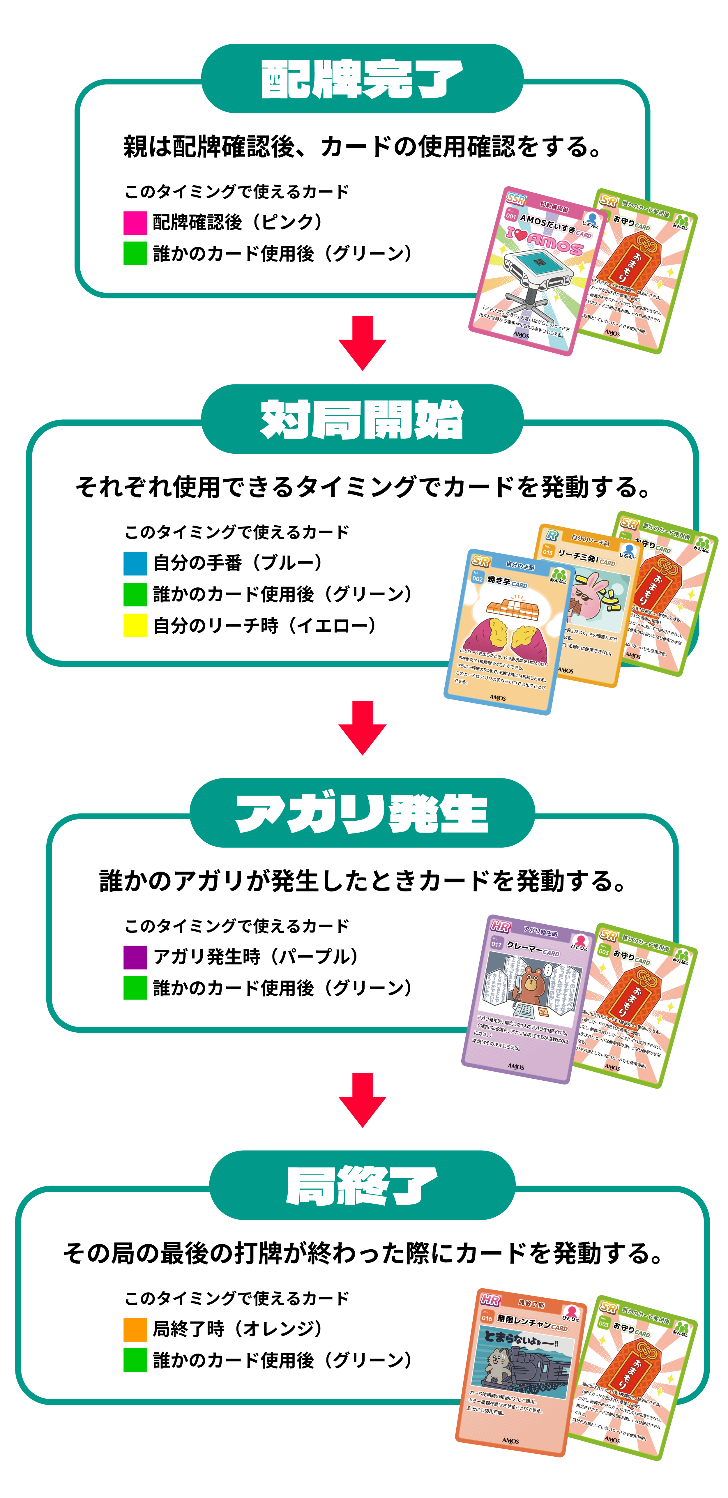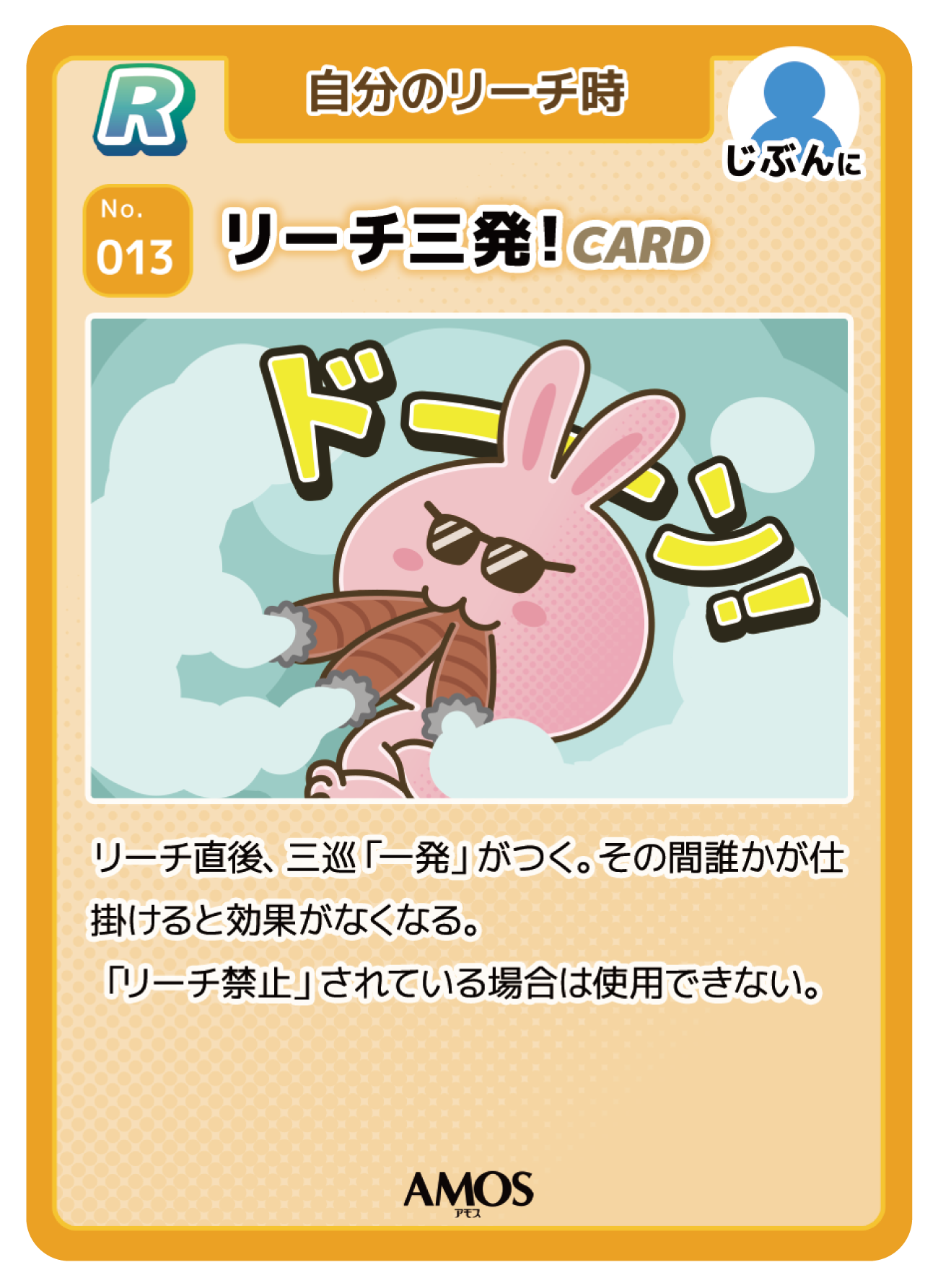 ・各プレイヤーは1半荘(東南戦)に最大5枚までカードを使用可能。 ※同じ局内での使用の制限枚数は無いが、同時に2枚使用はできない。 例 スーパーリーチカードとリーチ三発!カードの併用